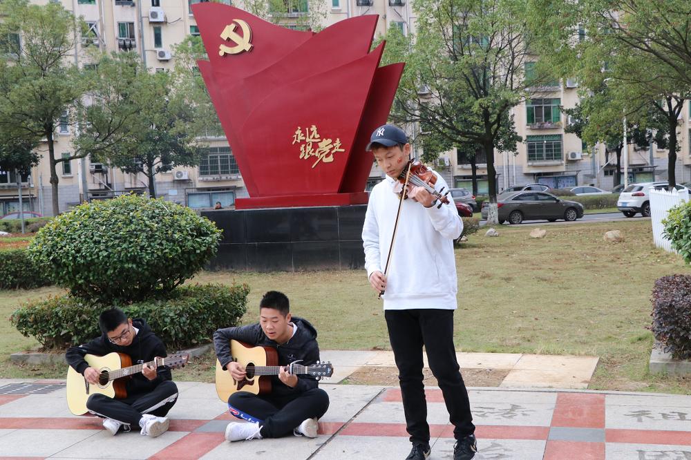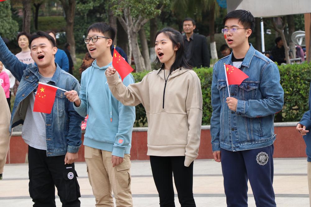 随着音乐前奏的响起,快闪活动正式开始,同学们通过吉他、小提琴等乐器共同演奏《我和我的祖国》。伴以优美的舞蹈,主唱同学挥动着国旗入场,悠扬的歌声荡漾在广场上,传达出同学们对祖国的浓浓爱意。