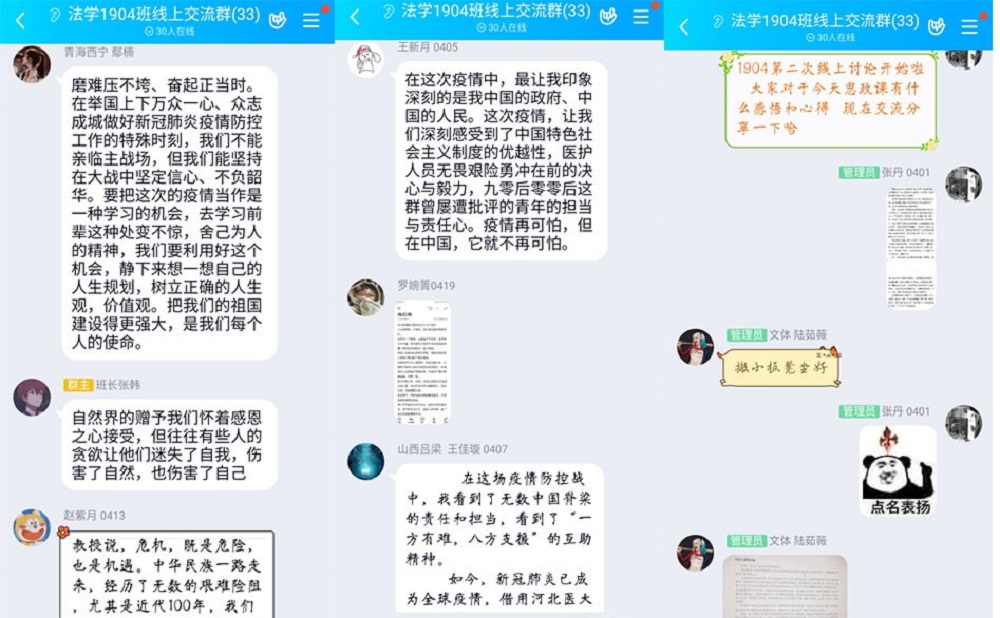 全体学生虽然相隔千里,但身为青年学子的使命感和爱国之心却时刻相连。同学们迅速响应学院号召,满怀求知热情,准时在家通过网络观看直播,仔细聆听四位教授在线讲述此次疫情防控阻击战带来的思考与启示。课后,同学们就所学所感进行了热烈的讨论。