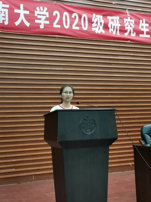 之后,老生代表2019级非法本法硕贾停同学对新同学的到来表示了欢迎,并就如何开启研究生之旅跟大家分享了自己的体验和感悟。首先,树立自己的法律信仰。法律职业者比一般社会大众更应该信仰和崇尚法律,忠于法律、维护法律尊严是对法律工作者的基本要求。其次,读好“有字之书”与无字之书。法学论著、立法文本、司法文书是“有字之书”,社会实践是“无字之书”。学习法律需要养成阅读文本的习惯,更需要学以致用、知行合一。
