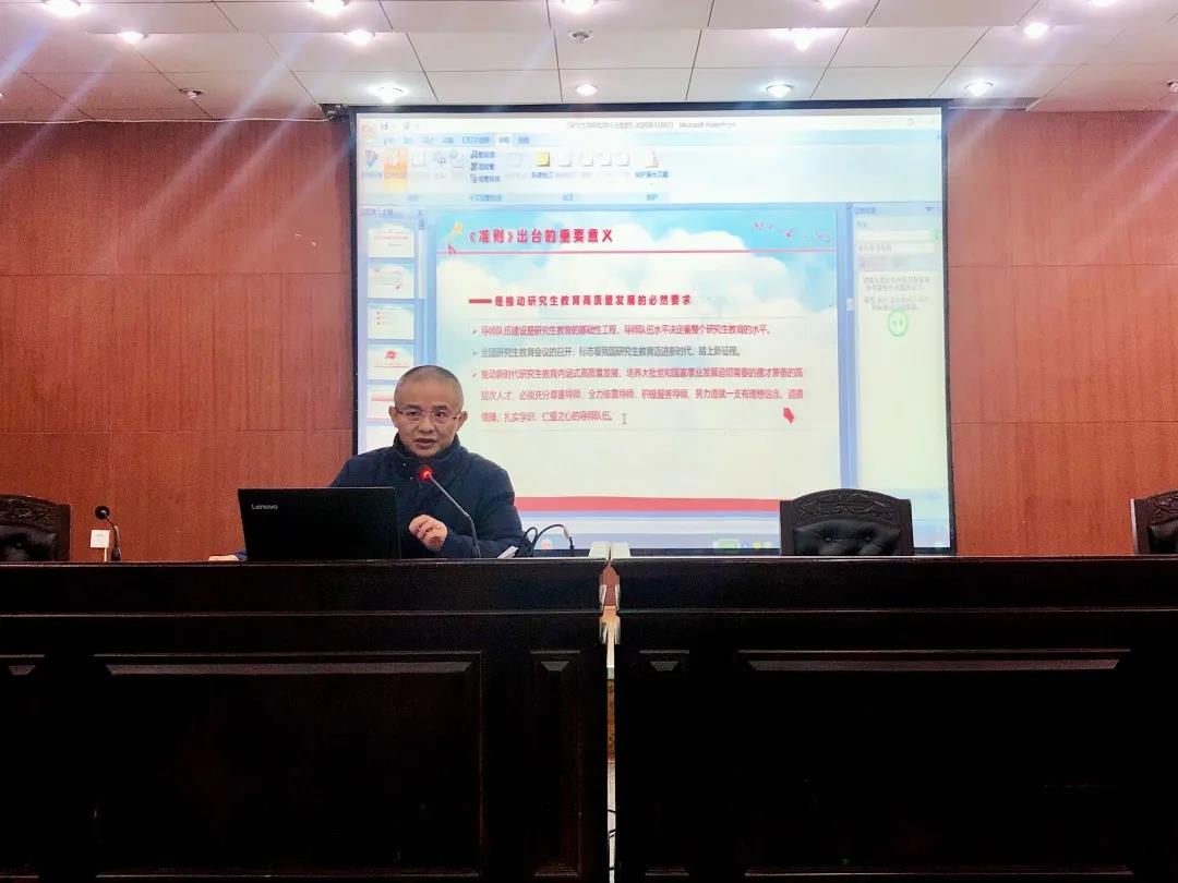 黎四奇副院长阐述了《研究生导师指导行为准则》出台的重要意义,带领全体导师共同学习了《总则》的全文内容,他强调:第一,研究生教育要坚持正确的方向,坚持以习近平新时代中国特色社会主义思想为指导,模范践行社会主义核心价值观,引导学生梳理正确的世界观、人生观、价值观,坚持立德树人,加强研究生思想政治教育;第二,研究生教育要聚焦学风建设,严格遵守学术规范,严格把关论文质量,不得有违反学术规范、损害研究生学术科研权益等行为,要把“传道济民、经世致用”作为研究生培养质量的检验标准;第三,要构建和维持和谐的师生关系,研究生导师队伍建设要抓好师德、抓牢投入,确保精心,尽力投入研究生的指导和培养中,同时,强调对待学生要“严”与“爱”结合。既做学业导师,又做人生导师。