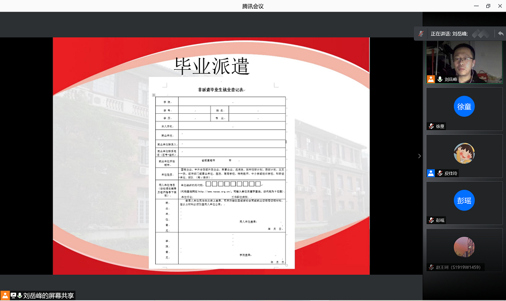 随后,刘岳峰老师针对毕业派遣问题进行讲解,包括毕业派遣的核对流程,以及就业与非派遣就业、出国和自主创业的相关内容。