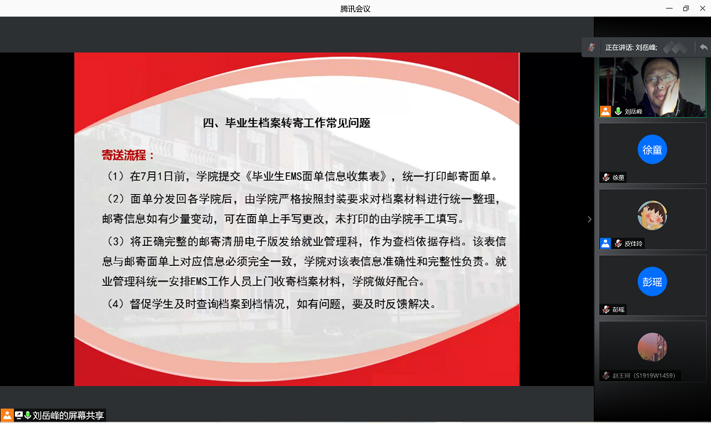 之后,刘岳峰老师又解读了毕业生档案转寄工作中的常见问题,包括毕业生档案的寄送流程、归档内容和毕业材料整理工作分配等,强调了毕业生档案整理的重要性,并讲述实例以提醒大家重视此问题。