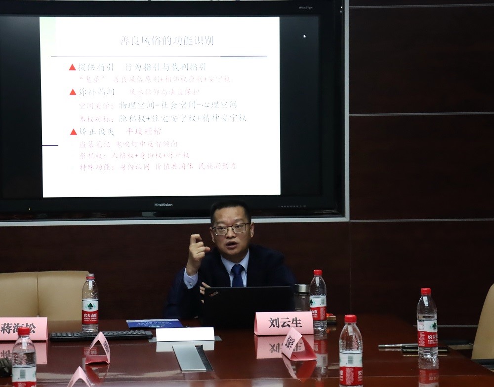 在“民法典文化解读”这一宏大问题中,刘云生教授具体选取了“善良风俗解读”这一主题进行讲座。刘教授首先阐明,善良风俗是法律认可并具有权威性、调控力的主流伦理道德法则与行为准则。他通过讲述小两口拆掉老人灶台的案例,生动具体地讲明了何为“善良风俗”,以及如何看待“善良风俗”。他指出,类似灶神崇拜这种中国传统古文化,不只是单纯的民俗信仰,还代表着民间禁忌,反映的是一种精神自由和人格尊严,必须予以尊重。