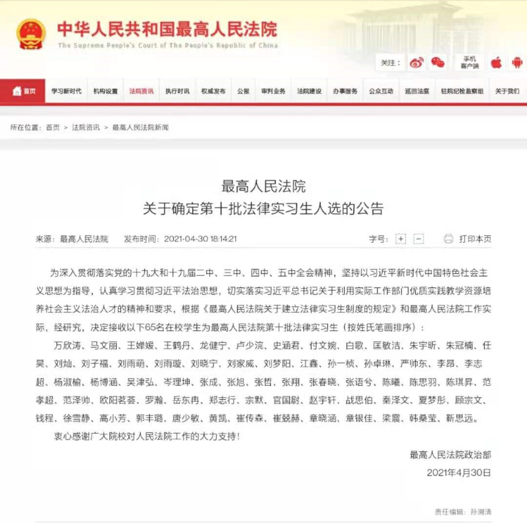 为深入贯彻落实党的十九大精神,坚持以习近平新时代中国特色社会主义思想为指导,认真学习贯彻习近平法治思想,切实落实习近平总书记关于利用实际工作部门优质实践教学资源培养社会主义法治人才的精神和要求,进一步深化人民法院与法律院校的交流合作,最高人民法院面向全国高等法律院校和法律研究机构接收在校学生,进入最高人民法院实习。