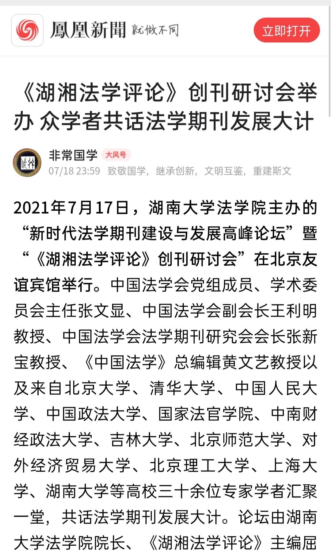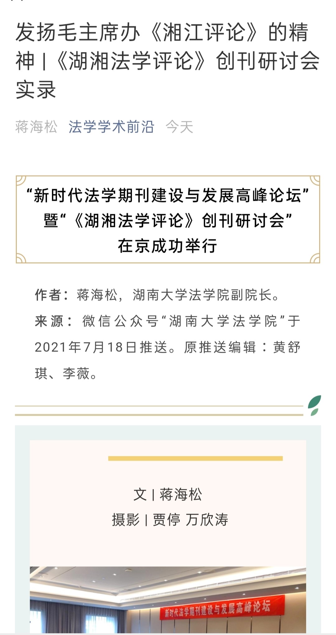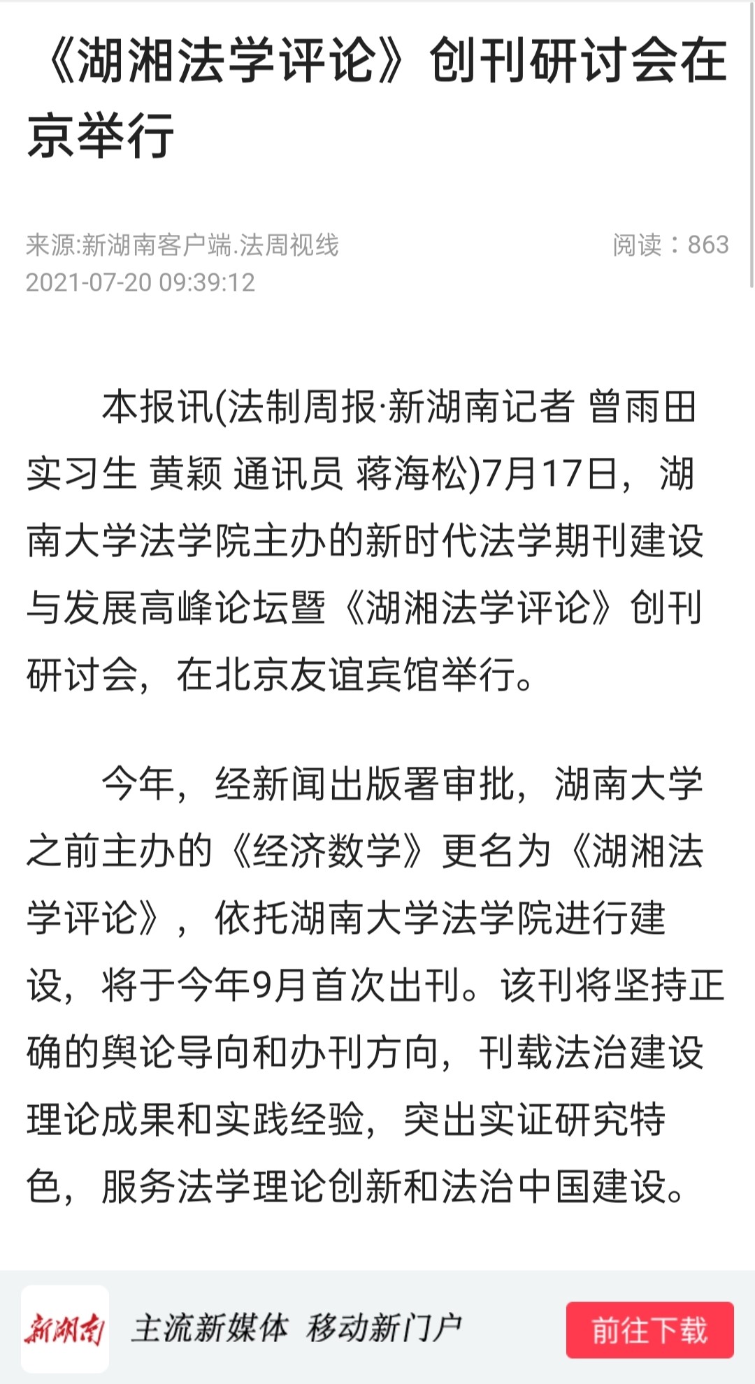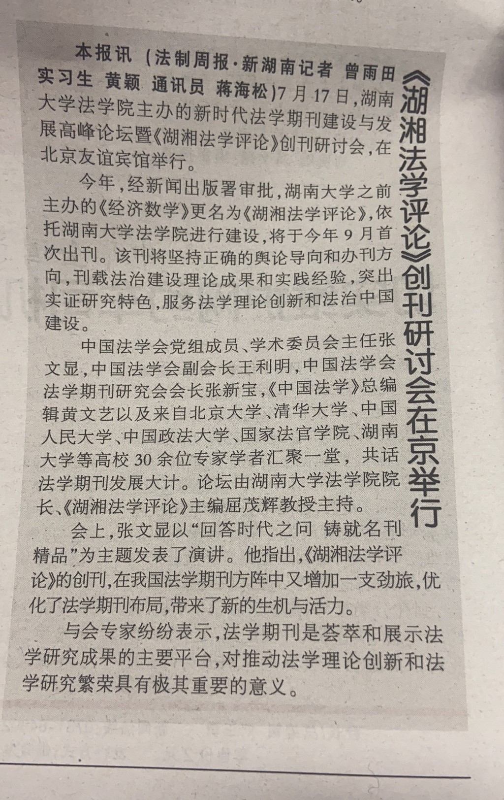主办的“新时代法学期刊建设与发展高峰论坛”暨“《湖湘法学评论》创刊研讨会”在北京友谊宾馆举行。《湖湘法学评论》的成功创刊及研讨会的成功举办引发媒体密集报道。目前,已有《光明日报》、人民网-人民资讯、中国新闻网、法治日报—法制网、检察日报-正义网、《法治周末报》、凤凰网、《法制周报》、新湖南客户端、《三湘都市报》、红网、《长沙晚报》、腾讯网、华声在线等为此推出报道,《中国法学》杂志社公众号、教授加、法学学术前沿、法科生之家、法研在线等知名法律界公号推出了详细报道。