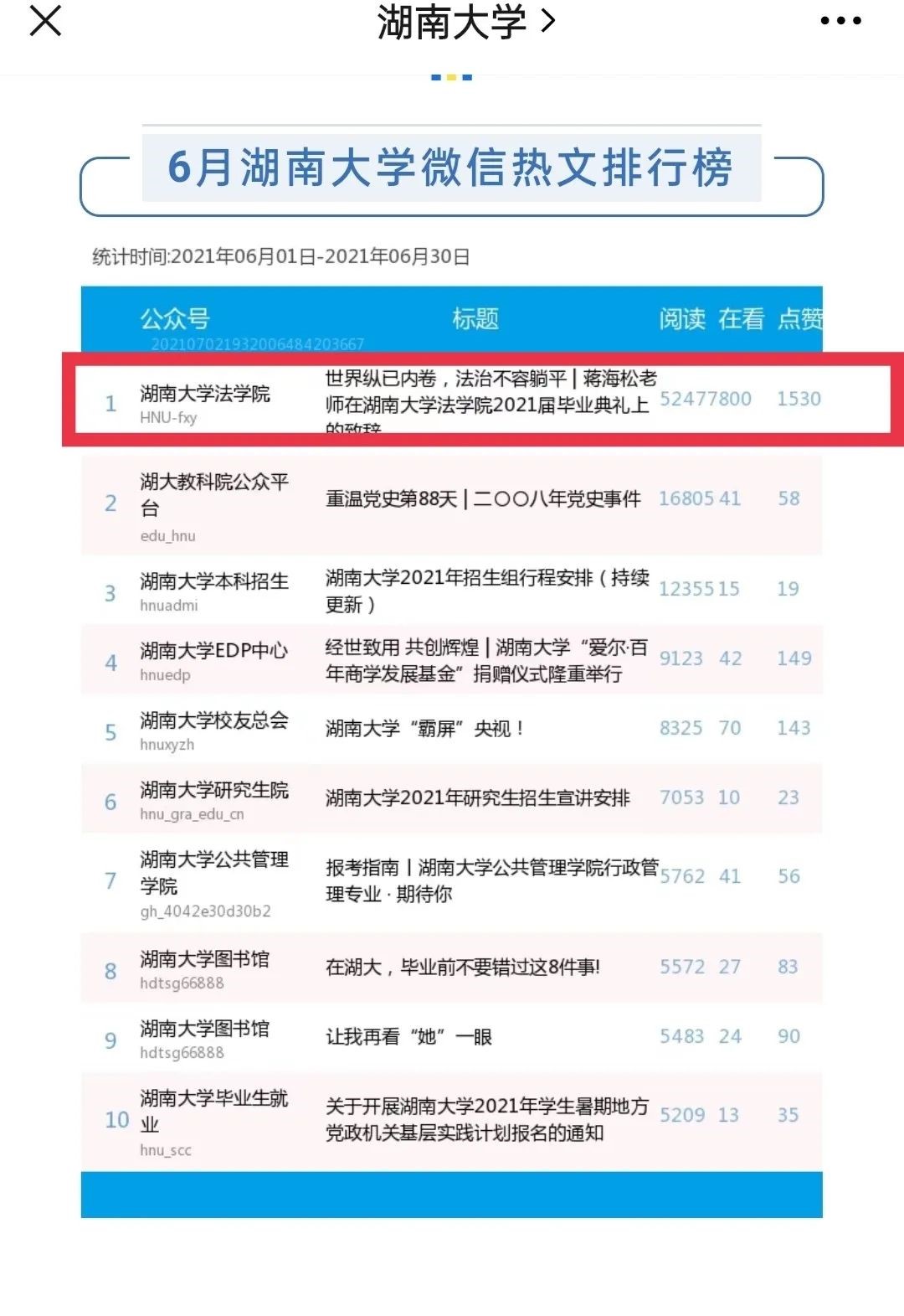 多次蝉联湖大校园新媒体影响力十强榜单,并在2021年6月榜单中跃居全校新媒体排行榜第一名。