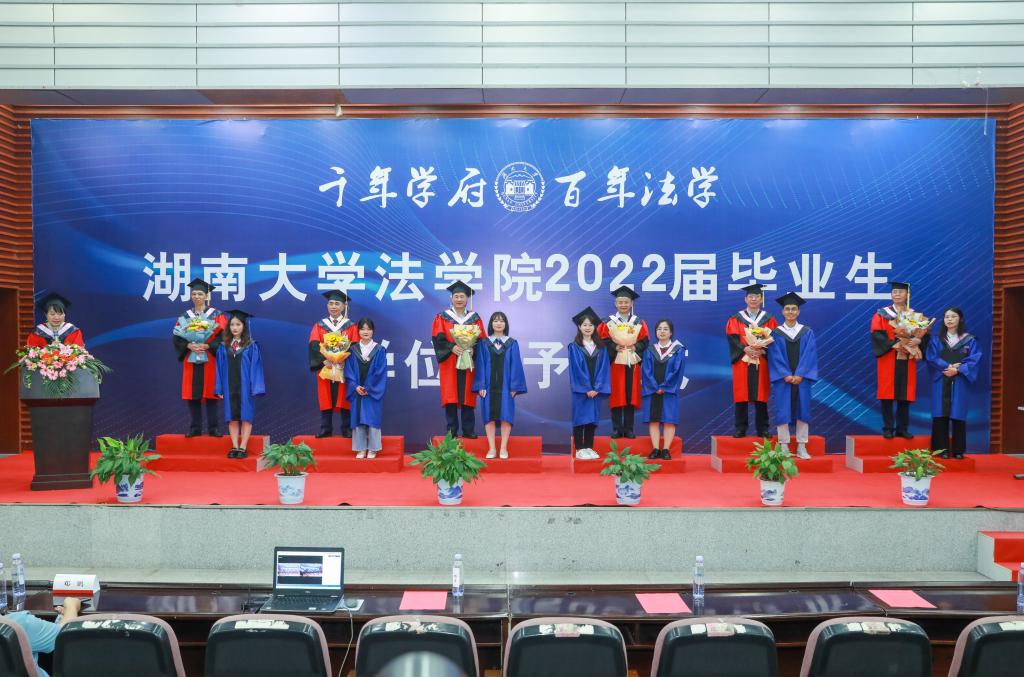 2022年学位授予决定》,对9位法学博士、195位硕士研究生及160位本科生作出授予学位的决定。宣读完毕,每一位毕业生身着学位服,整齐有序上台,张智辉、谢佑平、黎四奇、屈茂辉、郑鹏程、肖海军、李小明、高中等学术委员会成员为毕业生颁发证书、拨穗授位并合影留念.