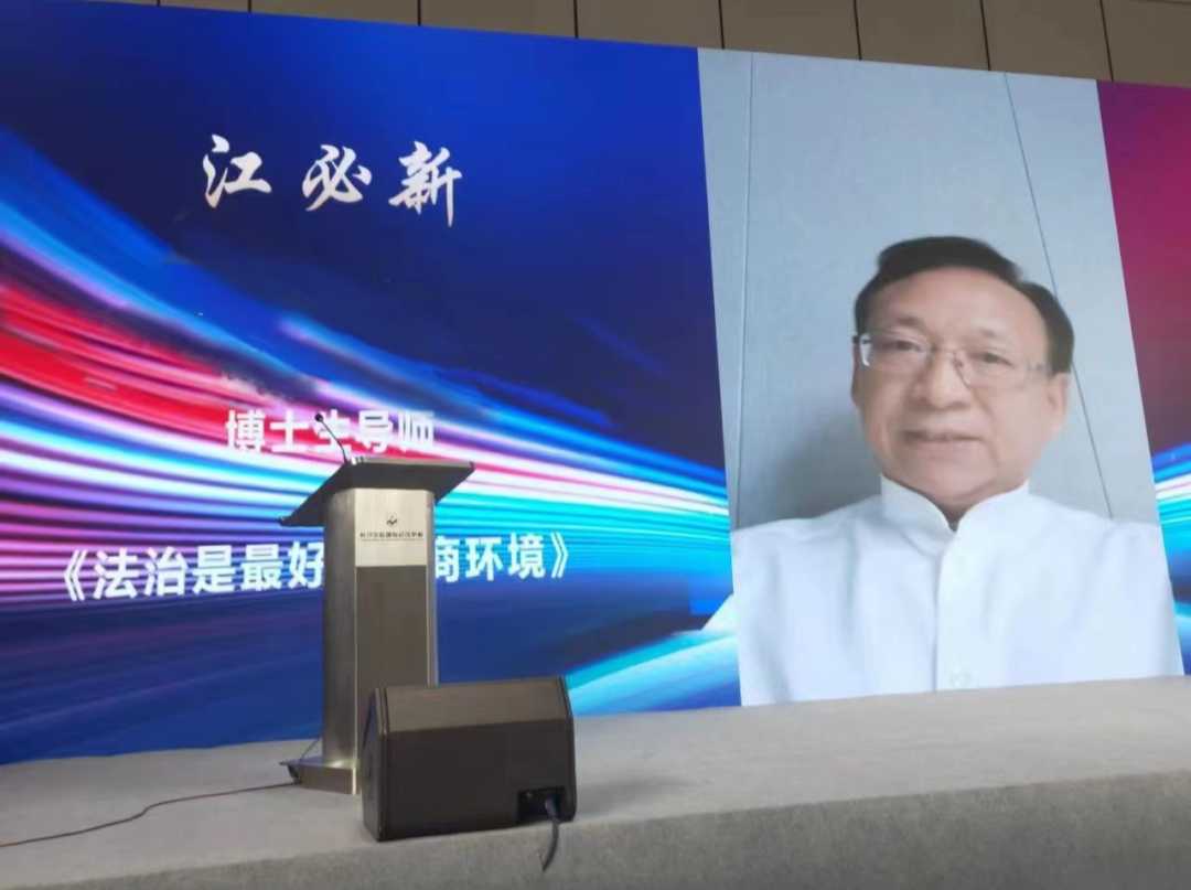 教授、博士生导师江必新线上做了主旨演讲《法治是最好的营商环境》,他从四个方面深入浅出地阐释了这一重要命题。他指出,构建法治化营商环境是全面贯彻落实习近平法治思想的重大举措。《中华人民共和国民法典》等重大法治成果对我国营商环境的改善和优化起到至关重要的作用,比如全面确定市场主体的法律资格、巩固市场机制运行的宏观背景、创设市场主体平等竞争的法律前提、确立市场主体意思自治的原则、赋予市场主体丰富的财产权利、增强市场交易安全、系统保障市场主体的合法权益、确立完备的市场交易规则、明晰市场主体的义务和责任、强化公权力机关改善和优化营商环境的义务和责任、优化政府依法行政等方面。