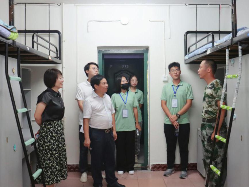 “同学们好!这几天的军训生活还习惯吗?”在新生宿舍,易书记亲切地询问学生们的基本情况、对新环境的适应情况以及一周以来的军训感受。他嘱咐新生们注意宿舍卫生与个人安全问题,并鼓励大家要尽快适应大学生活,在军训期间也应抓紧时间学习,早日进入学习状态。