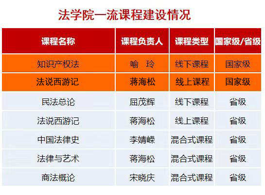 始终坚持推进一流课程建设,不断创新教学模式,提高教学水平。此前,喻玲《知识产权法》入选首批国家级一流本科课程, 屈茂辉《民法总论》、蒋海松 《法说西游记》、蒋海松《法律与艺术》、李婧嵘《中国法律史》、宋晓庆《商法概论》入选湖南省一流课程,为学院一流课程建设奠定了坚实基础。