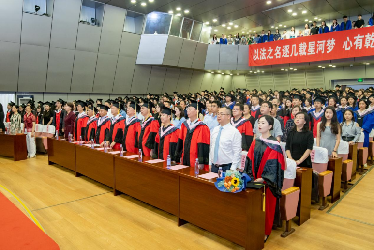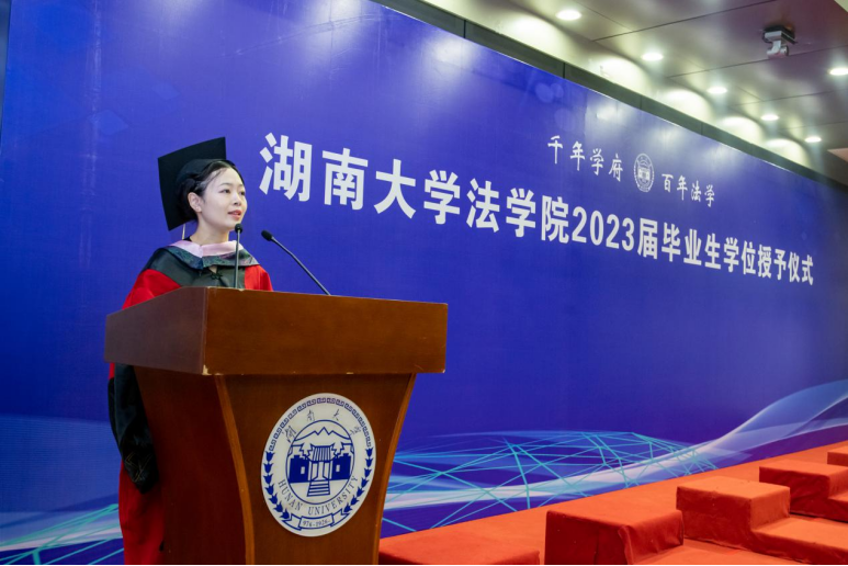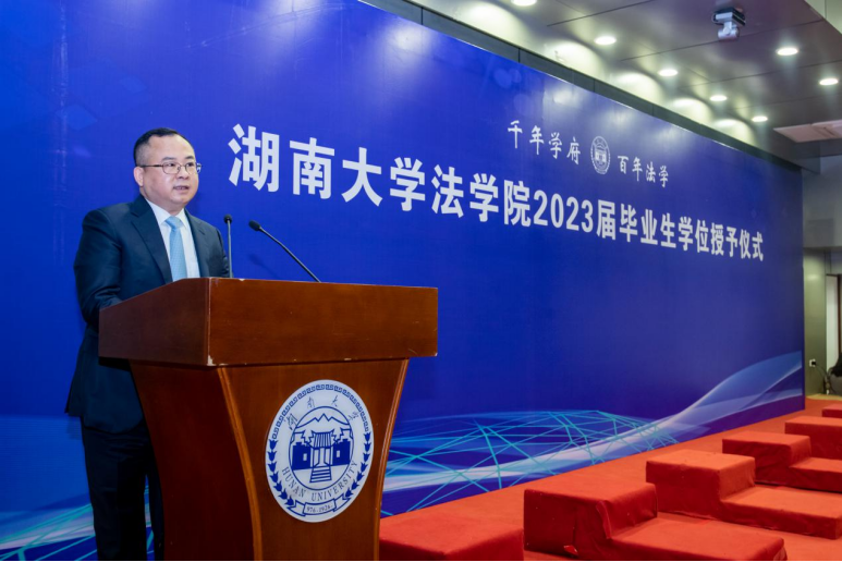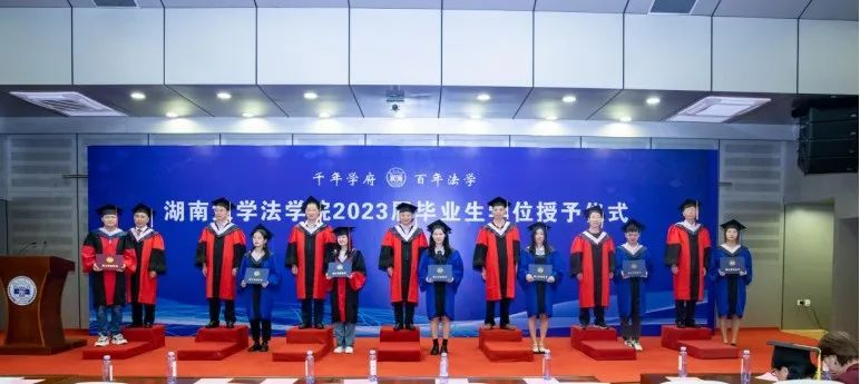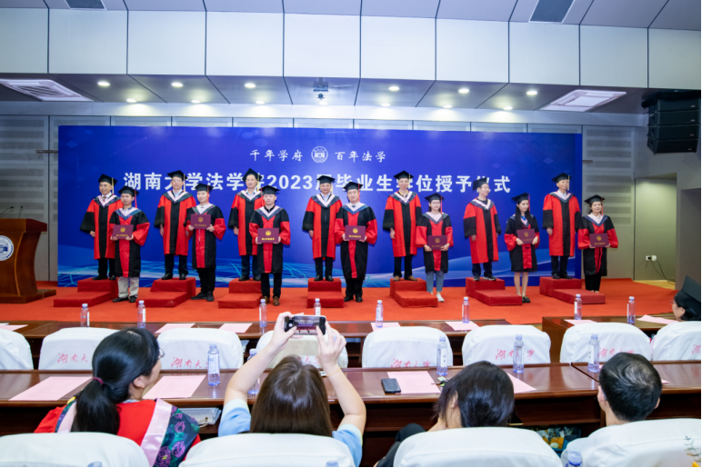 2023 年学位授予决定》,对8位法学博士、279位硕士研究生及175位本科生(包括二学位)作出授予学位的决定。随后,屈茂辉、黎四奇、张智辉、谢佑平、肖海军、郑鹏程、高中老师为全体毕业生一一正冠拨穗、颁发证书并合影留念。