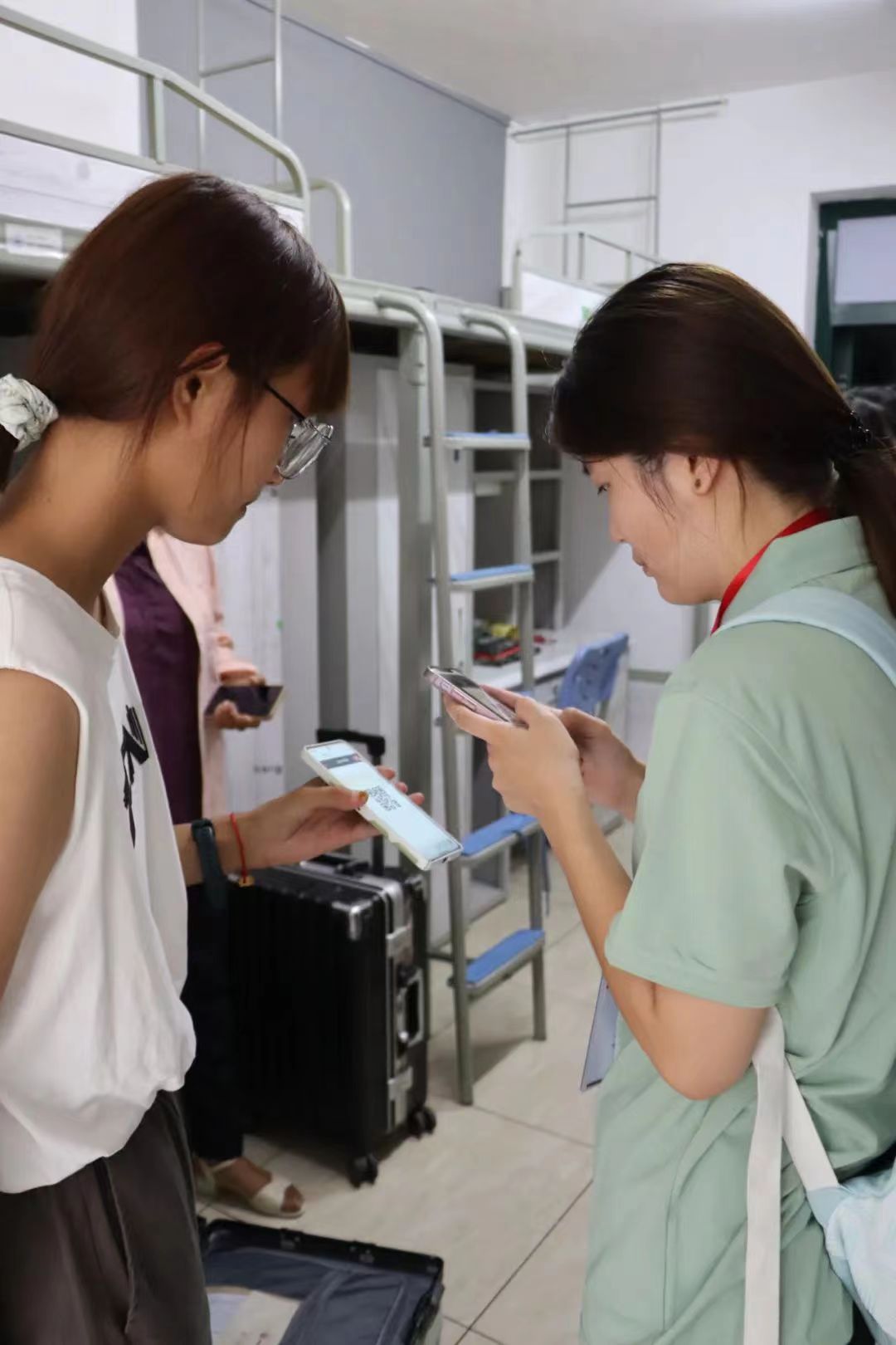 迎新团队为新同学扫描报到码,核对信息并叮嘱注意事项。