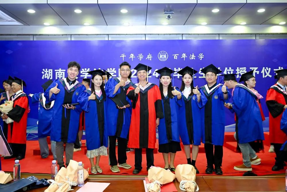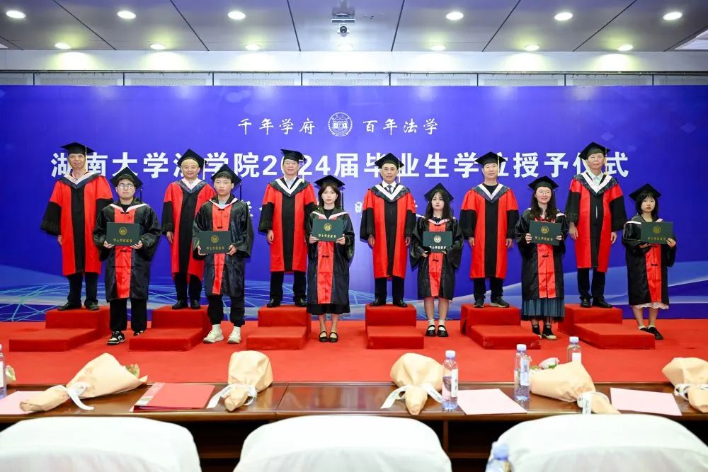 2024年学位授予决定》,对11位法学博士、262位硕士研究生及166位本科生作出授予学位的决定。随后,屈茂辉、黎四奇、谢佑平、肖海军、郑鹏程、高中老师为全体毕业生一一正冠拨穗、颁发证书并合影留念。