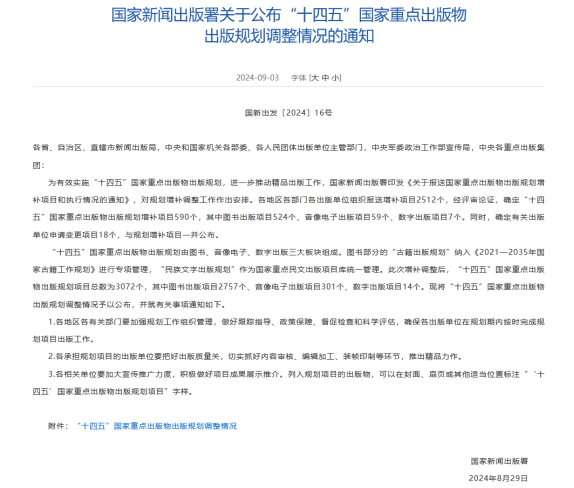 “十四五”国家重点出版物出版规划由图书、音像电子、数字出版三大板块组成,是我国出版业最高级别的出版专项规划,旨在进一步提高精品出版能力,推动出版业高质量发展,助力科技强国和文化强国建设。
