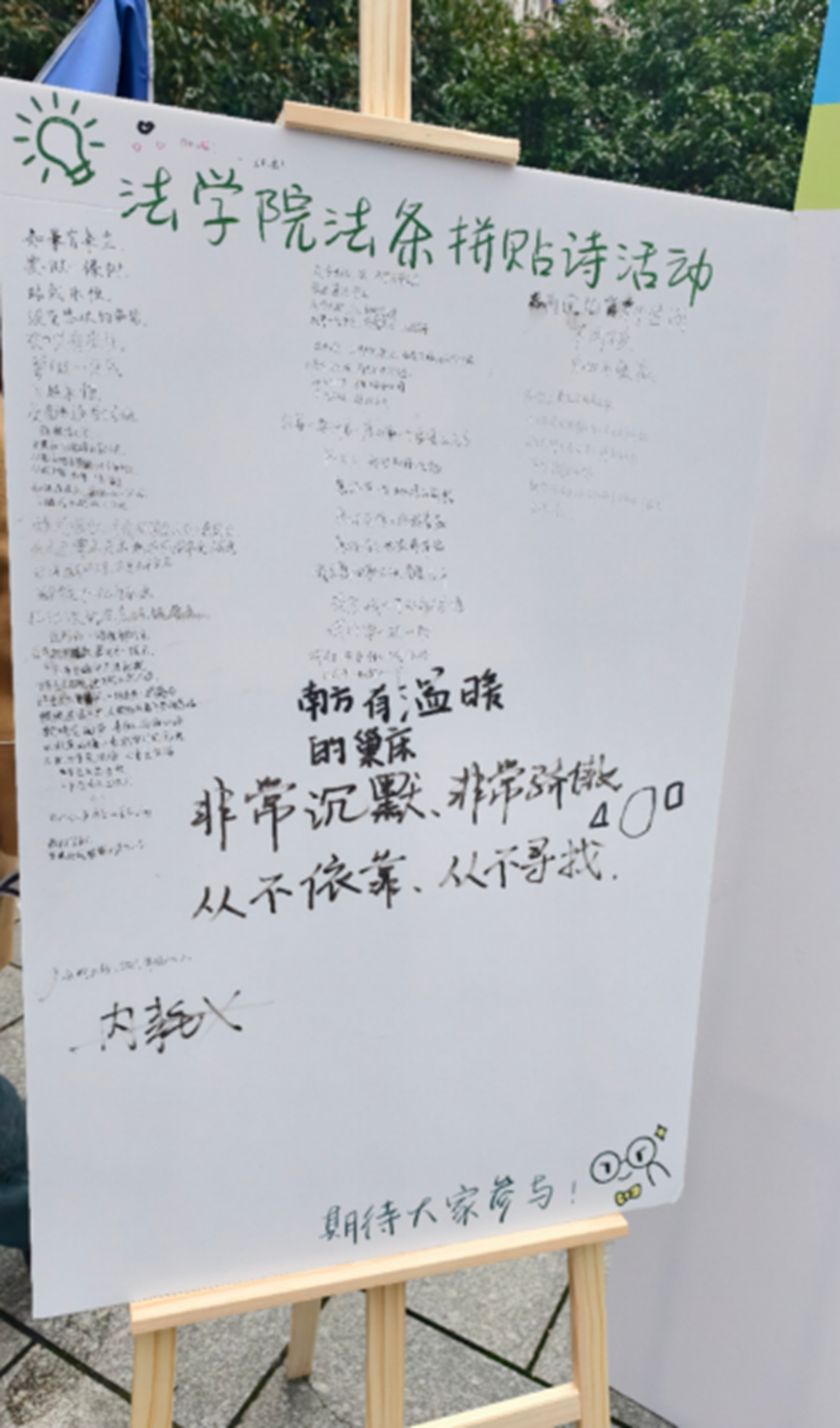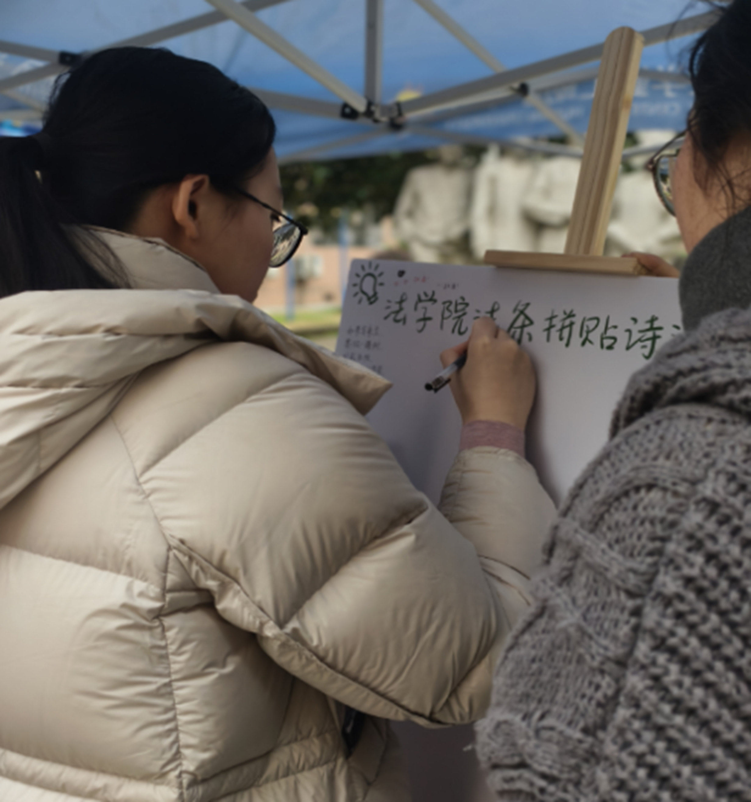 而限时法条拼图、倒述法律术语、法条拼贴诗创作等活动区域,也受到同学们的欢迎。限时法律拼图环节考验同学们对法条的理解能力和快速应变能力,更是在轻松愉快的氛围中向同学们普及了与消费者权益保障法相关的法律知识·;倒述法律术语的挑战让同学们开动脑筋,突破常规思维,在逆向表达中加深对专业术语的记忆和理解;法条拼贴诗创作区域同学们更是挥洒文采,留下了十分真挚的祝福与妙趣横生的话语。在这些富有趣味的游戏中,同学们不仅收获了欢乐,更重要的是,他们对法律条文的理解也在不知不觉间更上一层楼。