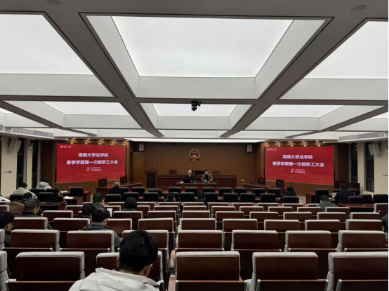 在模拟法庭召开2026年春季学期第一次全体教职工大会。副院长湛建云主持会议。