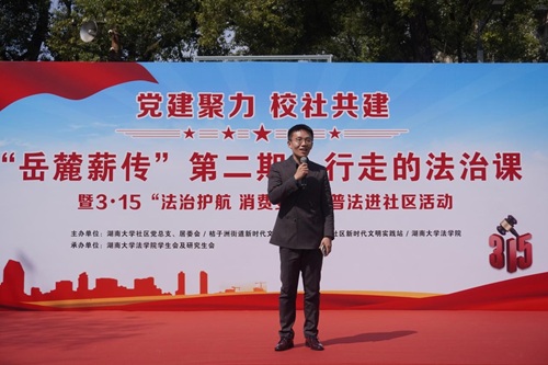 湖大社区党总支书记樊秋琳致辞,她指出法进社区是深化校社联动、推进法治教育与思政教育融合的重要载体。此次活动不仅为社区居民送上了一堂干货满满的“法治公开课”,更搭建起高校专业力量服务基层治理的桥梁,让法治精神真正走进群众、融入生活,是一堂生动的普法课、思政课。