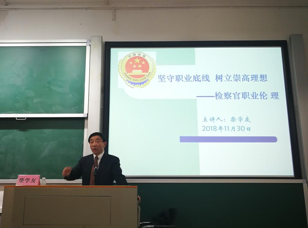 郭哲老师首先向在座的学生介绍了柴学友作为检察长的经历,并对柴学友会长的到来表示欢迎。接着柴学友会长主要从“忠诚、为民、担当、公正和廉洁”五个方面展开介绍,并结合实务经验和案例为同学们讲解检察官职业道德基本准则。