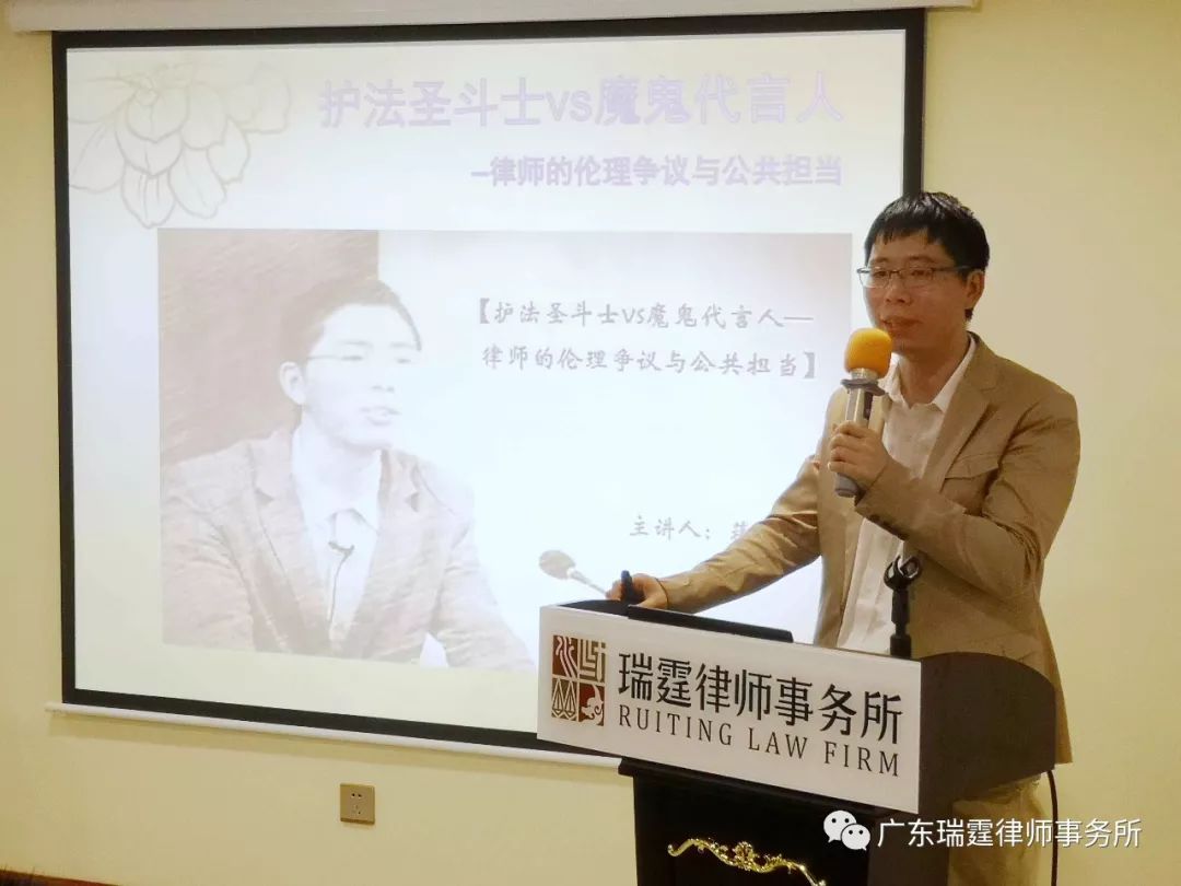 副教授蒋海松老师赴深圳进行“瑞霆大讲堂”第三期学术讲座《魔鬼代言人VS护法圣斗士—律师职业伦理二重性拷问》。瑞霆律师事务所主任王丽娜、执行主任王先友及深圳市福田区诸多律师事务所主任学员等共计40余人参与讲座,本次讲座由高级合伙人林志平主持、副主任陆晖致欢迎辞。