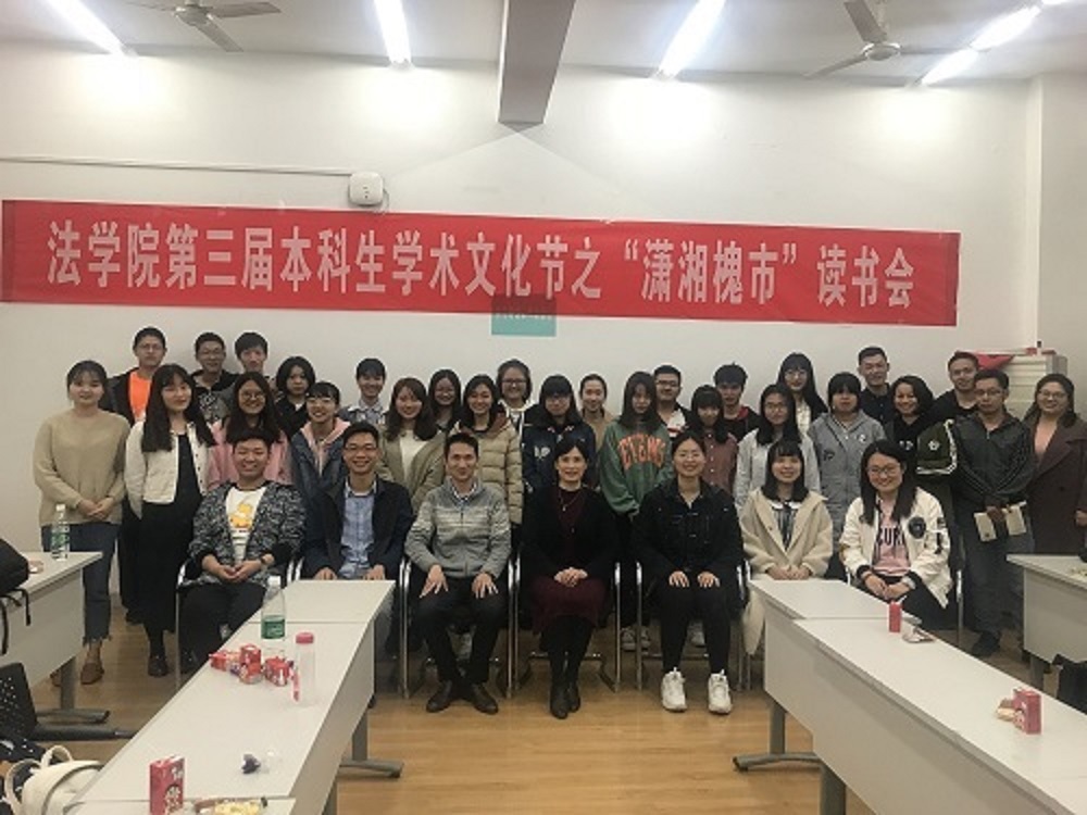 郭哲副教授,湖南省长沙市芙蓉区法院法官刘易高和湖南龙冠律师事务所律师朱金伟担任评议嘉宾。2017级法学一班全体同学和部分研究生参加了本次读书会。