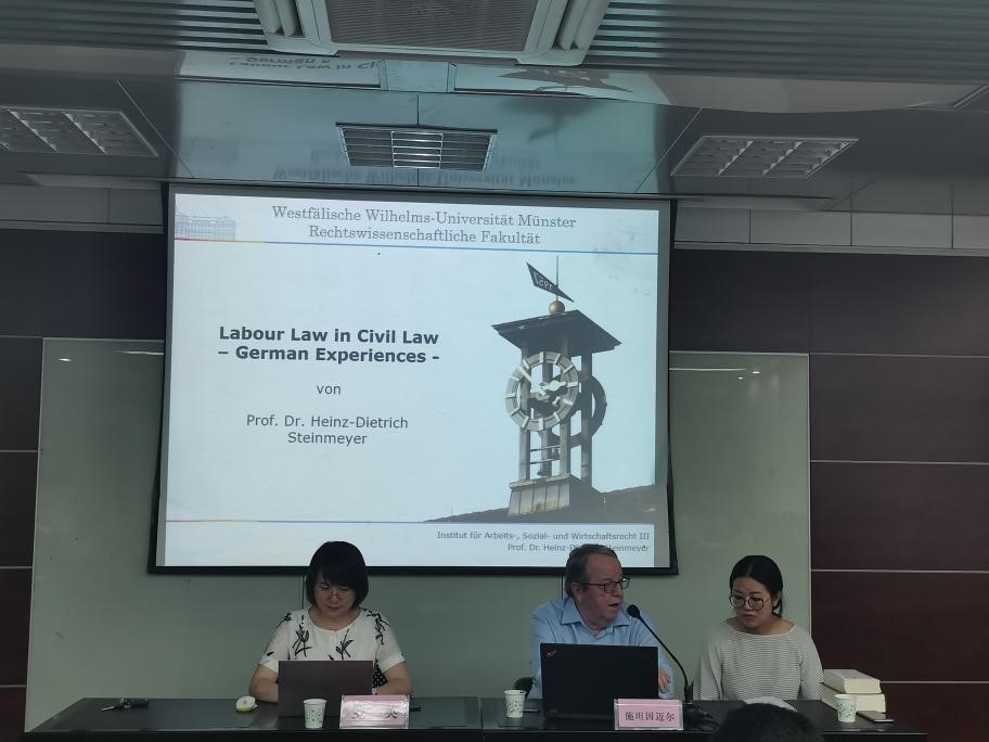 讲座伊始,施坦因迈尔教授先对此次讲座的主要内容进行了简要地介绍,提出了五个问题:(1)劳动法是否属于民法;(2)劳动法能否作为民法典的一部分;(3)在德国怎样解决这个问题;(4)德国在这个问题上有着怎样的历史;(5)关于解决这个问题德国的经验。接下来的讲座围绕探索这五个问题的答案而展开。对于劳动法与民法的关系,施坦因迈尔教授带领听众从德国劳动法发展的历史中发现规律,他总结道:劳动合同是民事合同,但不能说劳动法就属于民法,因为不是所有关于劳动合同的规定都在德国民法典(BGB)中。但对于劳动法与民法典的关系,教授谈到,德国曾经至少有过两次劳动法法典化的趋势,但都没有成功,有一部分原因是要考虑到各方的利益。教授认为,劳动合同不可能脱离民法典单独存在,这会造成比如代理或未成年人劳动合同需要单独进行规定等问题,这无疑是行不通的。所以他坚信,关于劳动合同的规定属于民法典的一部分,这也是当前学界的主流观点。最后,施坦因迈尔教授表达了自己对中国民法法典化过程中劳动法的定位的一些见解,对我国民法典的编纂工作具有深刻的借鉴意义。