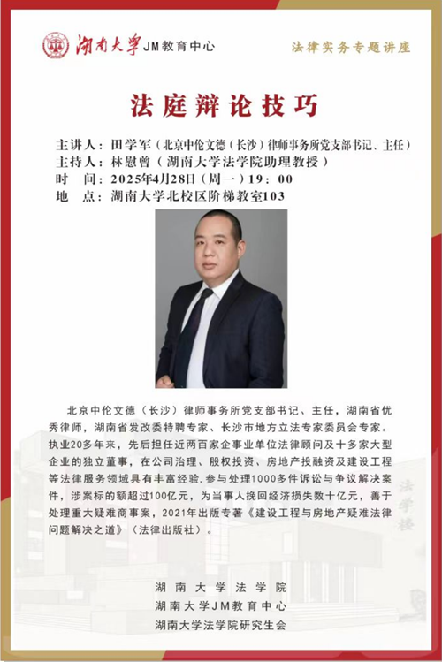 拟邀请省市法院、检察院、仲裁委、头部律所等司法实务领域具有丰富实战经验的优秀实务专家,开展JM实务论坛系列讲座课程,每周2-3场,连续12-14周,主题涉及刑事诉讼实务、民事诉讼实务、知识产权实务、仲裁实务、法律谈判与调解等领域的内容。系列讲座旨在通过实务专家的精彩分享,帮助学生深入了解司法实务中的前沿问题,掌握司法实务中的关键技巧,明确未来职业选择的方向与目标,着力培养一批既具备深厚法学理论功底,又拥有实务能力的高质量法律人才,为法治中国建设贡献力量。