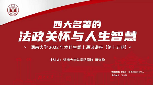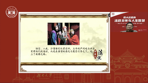 讲座伊始,蒋海松老师与当下防疫现状巧妙结合,戏说四大名著深刻影响了中国人的行为方式与话语方式。并以毛泽东主席痴爱三国西游、盛赞水浒红楼从中感悟革命道理为引,点明通俗小说承载着深刻的政治寓意和法律观念。随后,蒋老师围绕着法律智慧、政治洞察、团队管理、女性观念、心灵修行五个篇章,从法律观念和政治观念入手,谱写出一曲四大名著的法政智慧之歌。