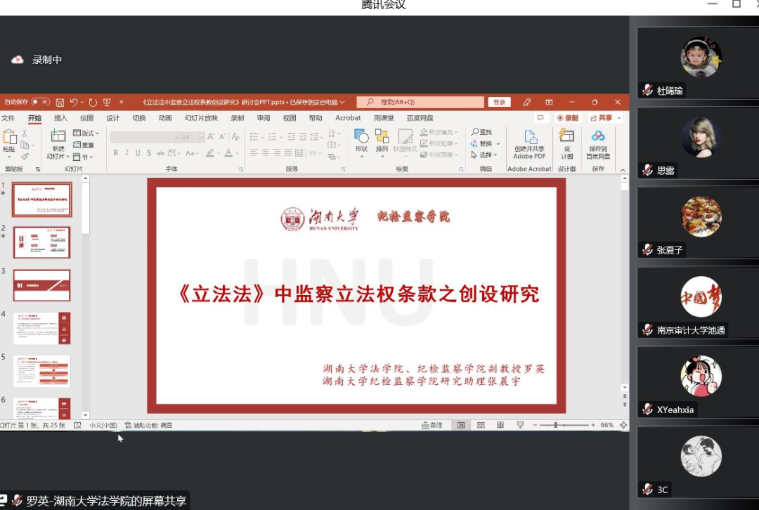纪检监察学院的建设情况对此次发言的主题选择进行了解释。其次,从形式法治和实质法治两方面,对修改立法法是实现监察立法权规范化的最优解做了阐释。在形式法治方面,她对现有的修改方案进行分析,指出修改立法法更有助于实现立法权配置结果的公平性和有效性,在技术层面能够实现技术可行性的最大化。在实质法治层面,她从修改立法法是立法工作者所认可的低位阶决定内容固定化的最终表现形式;修改立法法的适用场域聚焦于国家层面的法律规范,由立法法赋予监察立法权的底层逻辑,符合监察法治的原理;通过修改立法法来明确监察立法权本身具备宪制合理性,与我国新设立法权限以法律形式予以确认的惯例一脉相承;立法法的修改频次和实现契合于最短实现内实现监察立法权规范化表达的现实目标等四个方面,对修改立法法在实质法治层面的优越性进行了总结。最后,她对于具体条款的拟定做了报告。