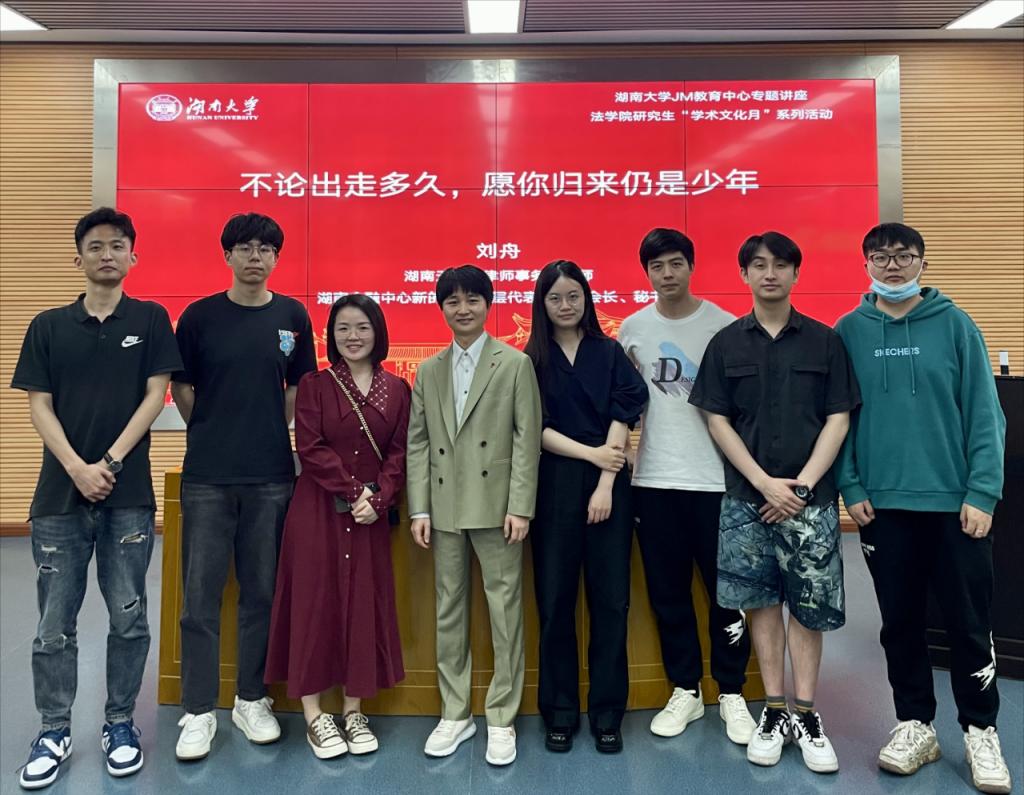 开展主题讲座。讲座主题为“不论出走多久,愿你归来仍是少年”,刘舟律师结合他参加律政纪录片和自身职业的经验,与同学们探讨了法律人的成长与修炼。