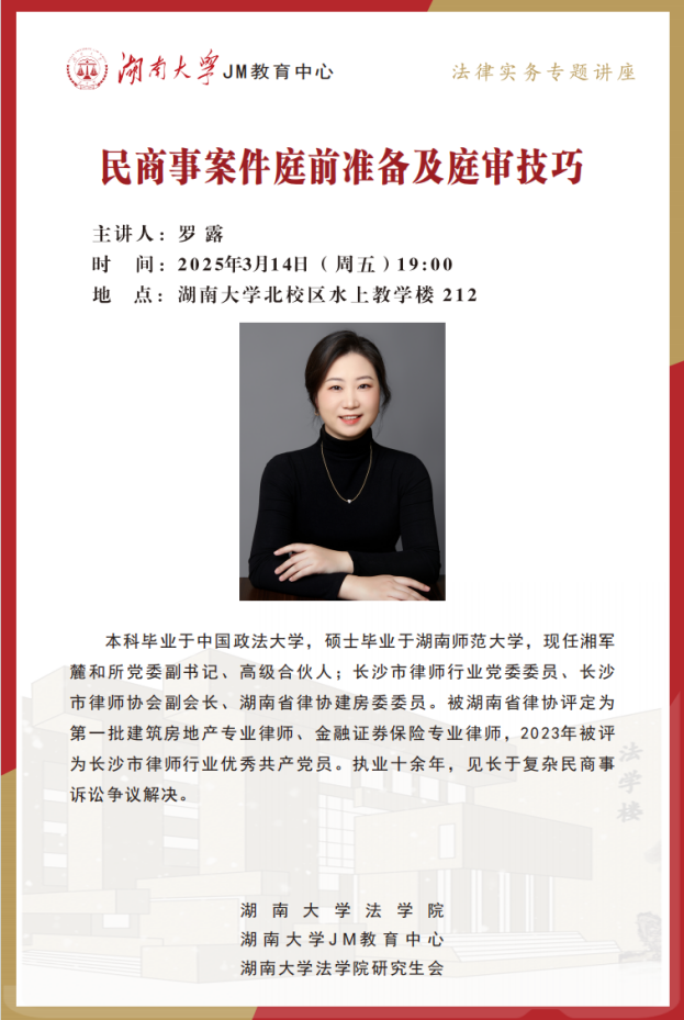 报告厅座无虚席,湘军麓和律师事务所高级合伙人罗露律师以“民商事案件庭前准备及庭审技巧”为主题,为学子们带来了一场充满实践智慧的精彩讲座。罗露律师本科毕业于中国政法大学,硕士毕业于湖南师范大学,现任长沙市律师行业党委委员、长沙市律师协会副会长、湖南省律协建房委委员。被湖南省律协评定为第一批建筑房地产专业律师、金融证券保险专业律师,2023年被评为长沙市律师行业优秀共产党员。执业十余年,见长于复杂民商事诉讼争议解决。本次讲座围绕诉讼的底层逻辑、诉讼的技术、青年律师成长等话题展开,为法科学子揭开了法庭博弈的实战密码。