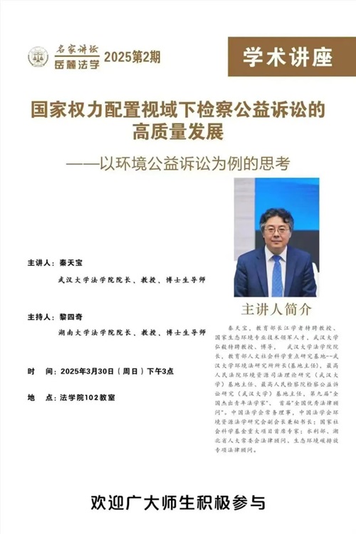 “岳麓法学名家讲坛”,主讲“国家权力配置视域下检察公益诉讼的高质量发展——以环境公益诉讼为例的思考”。讲座由香香漫画