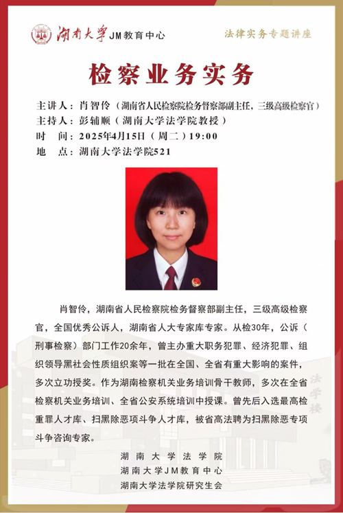 2025年4月15日19:00,湖南省人民检察院检务督察部副主任,三级高级检察官肖智伶在湖大521教室开讲“检察业务实务”,香香漫画