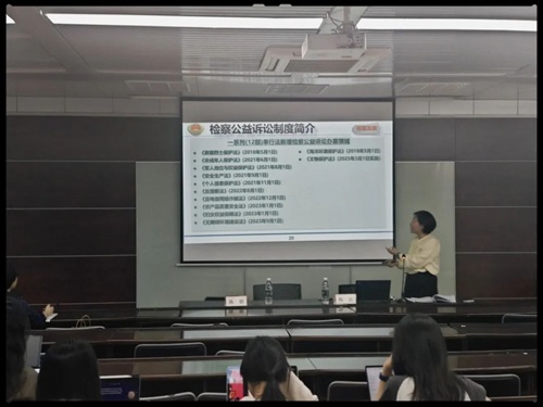 在典型案例介绍环节,陈菂并结合丰富的办案经验,给同学们展示了公益诉讼在实务操作的具体应用,从线索收集、初步调查、立案、检察建议、提起诉讼等全环节介绍了公益诉讼办案完整流程,选取介绍了一批优秀的指导性案例及典型案例,为同学们生动展示了公益司法保护“中国方案”的丰富经验及重大成效。