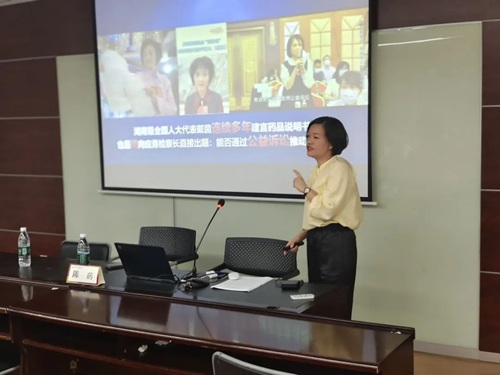 讲座正式开始,陈菂以湖南省检察机关办理的药品说明书无障碍适老化改造专案介绍为切入点,简要展示了检察公益诉讼部门如何通过监督办案的方式推动维护公益,由此获得良好的法律效果和社会效果,并重点介绍了人大代表建议与公益诉讼检察建议的双向衔接转化机制。