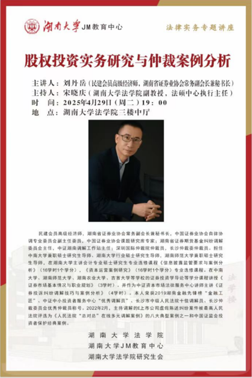 2025年4月29日19:00,民建会员、高级经济师、湖南省证券业协会常务副会长兼秘书长刘丹岳在湖大法学楼102教室开讲“股权投资实务研究与仲裁案例分析”,香香漫画