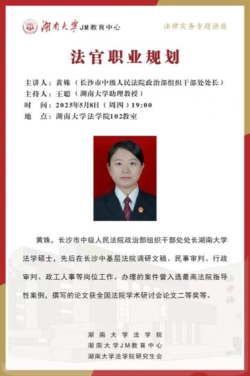 讲座围绕法官的成长路径、法院人员招录及职业发展等核心议题展开。黄姝首先分享了个人的成长经历,从基层法院到市级法院的历练,让她深刻体会到法官职业的多面性与挑战性。她指出,法官职业的魅力在于能够实实在在解决问题,对工作拥有一定的主导权,并能够在工作中不断锻炼自身技能,保持专业性。