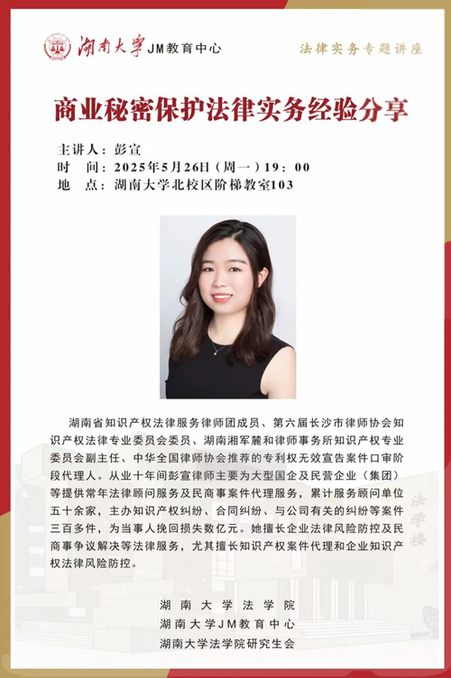 师生提供了商业秘密保护的前沿实务视角,也为构建“高校-律所”协同育人机制奠定了坚实基础。未来,学院将进一步深化与湖南湘军麓和律师事务所的合作,通过“实务导师进课堂”“模拟法庭实训”等形式,推动知识产权法学教学与司法实践的深度融合,着力培养理论功底扎实、实务能力突出的复合型法律人才。
