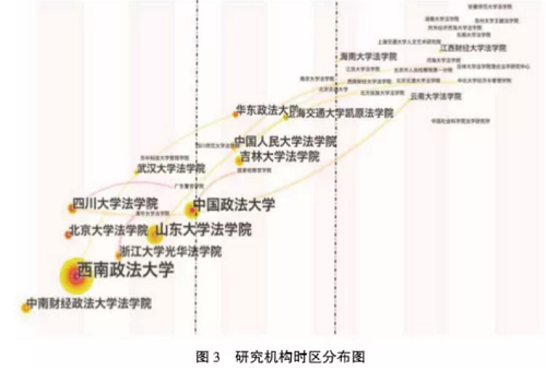 基于本文所选取的期刊文献样本,通过使用citespace软件对文献中所涉及研究机构进行分析, 首先得到研究机构的总体分析情况。如图2所示,西南政法大学、中国政法大学、山东大学香香漫画