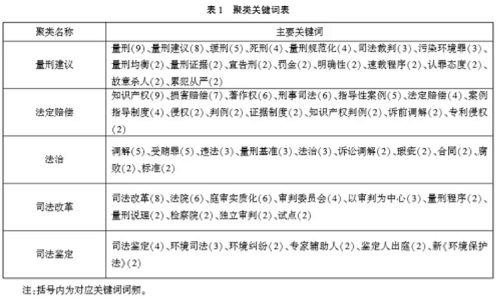 如表一所示,综合聚类分析结果及对各类别中所包含主要关键词的解读,可以得知,基于裁判 文书的实证研究成果中涉及最广泛的问题是刑事诉讼领域中的量刑问题,其次是知识产权侵权赔 偿与法治问题,最后是司法体制改革及环境纠纷等阶段性热点问题。而且,对于法治问题以及司法改革问题的研究也主要基于刑事诉讼程序来展开,对于知识产权的研究中同样涉及刑事诉讼方面 的具体问题,因此,完全可以确定,我国基于裁判文书法学实证研究所涉学科领域之中心在于刑事诉讼,对于其他领域的研究则极其缺乏。换言之,从总体分布上来看当前我国基于裁判文书法学实证研究之视域难谓宽阔。当然,我国法学实证研究尚处于发展进程中较为初级的阶段,研究者视域 需要随着本领域的发展而不断开拓。
