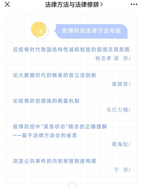 蒋海松副教授 在《法律方法》2020年第1期(总第30卷 )发表论文《疫情防控中“紧急状态”概念的正确理解——基于法律方法论的省思》。《法律方法》由知名学者陈金钊、谢晖主编,入选CSSCI法学集刊。