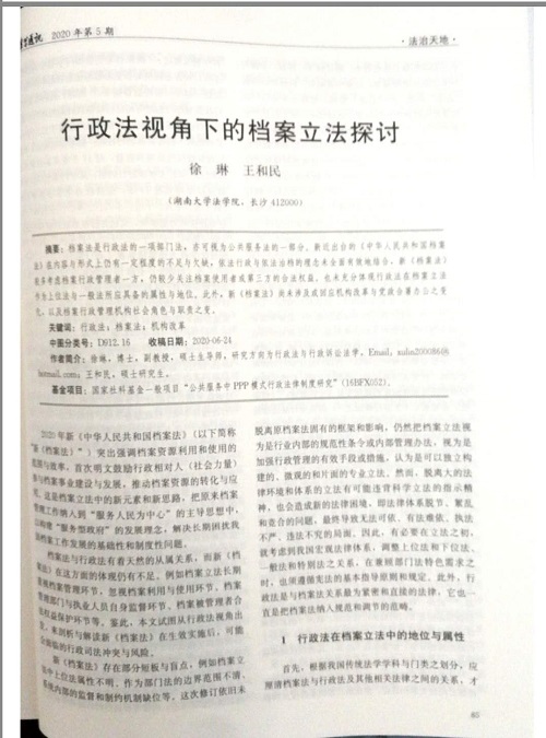 近期,徐琳副教授在CSSCI源刊 《档案学通讯》2020年5期发表论文《行政法视角下的档案立法探讨》。文章指出,新近出台的《中华人民共和国档案法》,在内容与形式上仍有一定程度的不足与欠缺,依法行政与依法治档的理念未全面有效地结合,此《档案法》较多考虑档案行政管理者一方,仍较少关注档案使用者或第三方的合法权益。也未充分体现行政法在档案立法作为上位法与一般法,所应具备的属性与地位。此外,新《档案法》尚未涉及或回应机构改革与党政合署办公之变化,以及档案行政管理机构社会角色与职责之变。其实,档案法是行政法的一项部门法,亦可视为公共服务法的一部分。