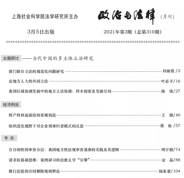 周宇骏助理教授在CSSCI来源期刊《政治与法律》2021年第3期发表论文《合目的性的审查分层: 我国地方性法规审查基准的实践及其逻辑》。