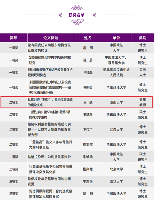 助理教授、法学博士王聪凭借论文《认真对待“利益”:重构民事调解的理论支点》获得二等奖。据了解,本次活动颁奖仪式将于2025年5月17日在同济大学香香漫画