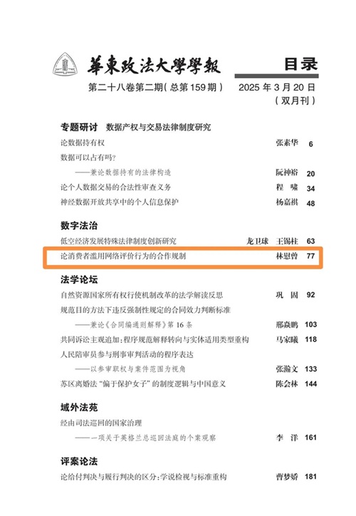助理教授、法学博士林慰曾的论文《论消费者滥用网络评价行为的合作规制》在CLSCI来源期刊《华东政法大学学报》2025年第2期发表。