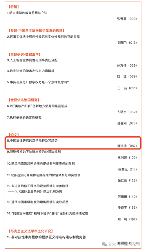 副教授、硕士研究生导师肖洪泳,在《政法论坛》2025年第3期发表论文——《中国法律研究的汉学视野及其趋势》。