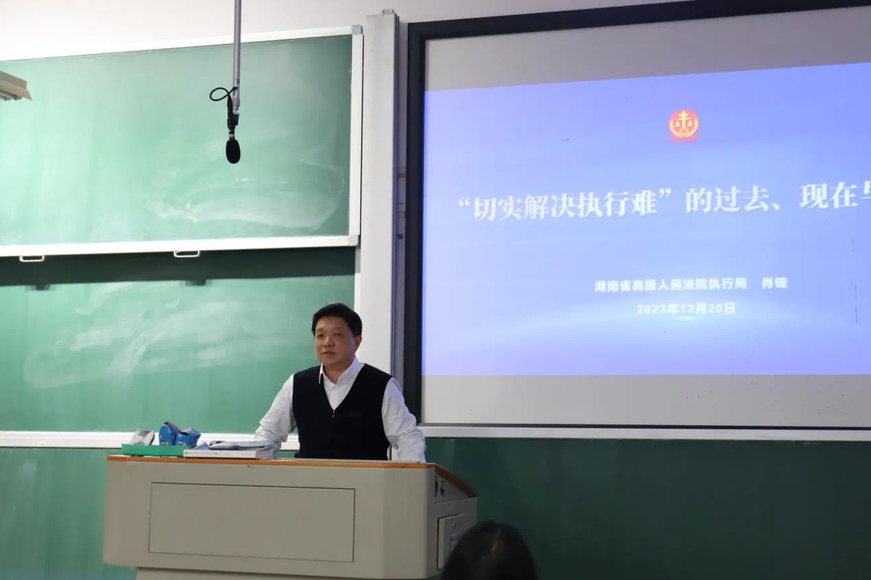 2023年12月20日下午,湖南省高级人民法院执行局肖锭法官在《法律职业伦理》课程负责人郭哲教授的邀请下来到教学东楼211教室,走进本科生课堂,讲授“‘切实解决执行难的过去’、现在与将来”实务分享课,为同学们带来一场精彩的关于执行过程中法官的职业素养与职业伦理的法治教育。