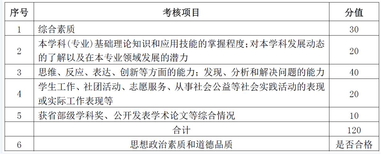 主要考察考生的思维、反应、表达、创新等方面的能力;综合素质、从事社会公益、思想政治素质及道德品质等方面的情况,共120 分。其中思想政治素质和道德品质主要考核考生的现实表现,内容包括考生的政治态度、思想表现、道德品质、遵纪守法、诚实守信等,其考核结果不计入考生总成绩,但考核不合格者,将不予录取。