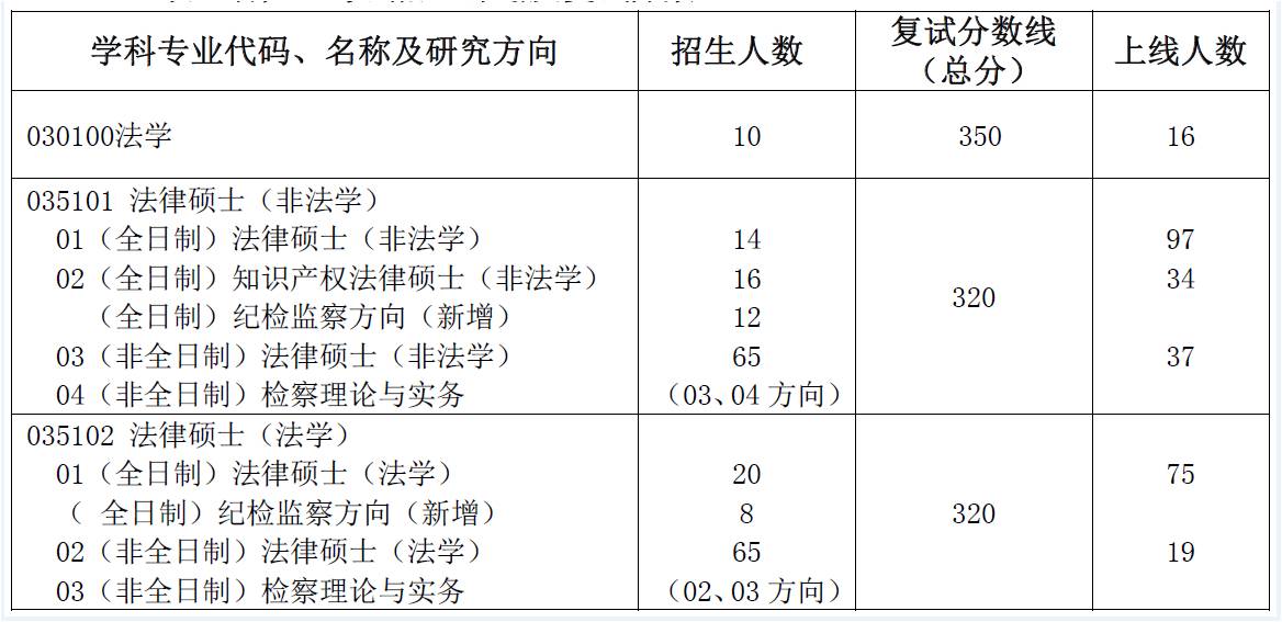 3. 学院新增纪检监察方向,该专业方向不单独录取。报考全日制法律硕士(含法本与非法本,不含知识产权方向)进入复试的考生,自愿选择是否同意录取该专业方向,学院根据总成绩(初试及复试总成绩之和)从高分到低分确定拟录取名单。