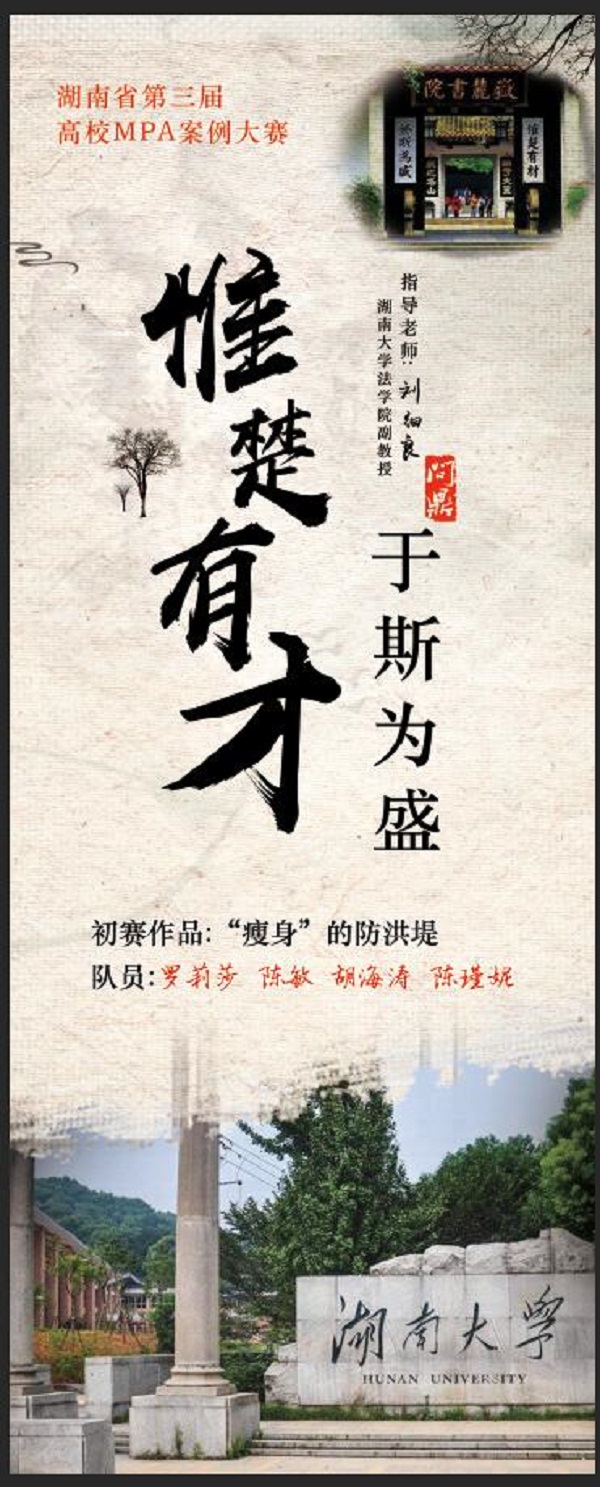 刘细良老师指导的MPA研究生胡海涛、罗莉莎和科学学位研究生陈敏、陈瑾妮组成“惟楚有才队”全程参与了此次比赛。初赛阶段,“惟楚有才队”撰写的《“瘦身”的防洪提》通过省内外专家对案例文本和使用手册进行匿名评审和筛选,在来自全省各大高校的55支参赛队伍中脱颖而出,顺利通过初赛、成功晋级现场复决赛。