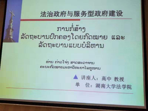 2019年10月20日下午,高中教授为老挝学员讲座《法治政府与服务型政府建设》,他介绍了中国法治建设的成功经验和服务型政府改革历程,提出应全面推进依法行政、提升政务服务质量和效率,加强法治思维,强化规则意识。